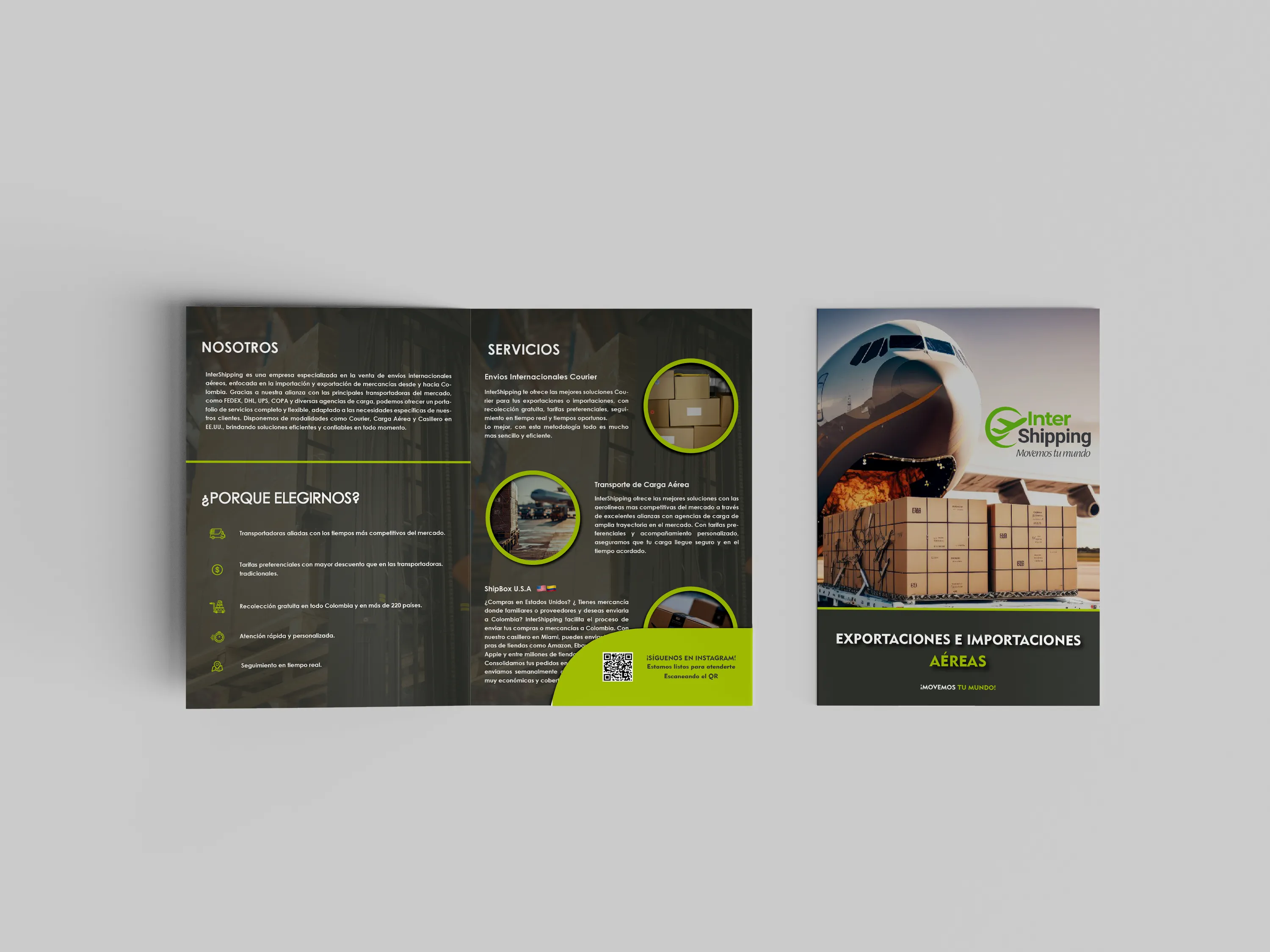InterShipping presenta su propuesta comercial mediante una carpeta corporativa diseñada en Illustrator. En la carpeta se organizan los servicios de exportación, importación y courier con una jerarquía visual clara.