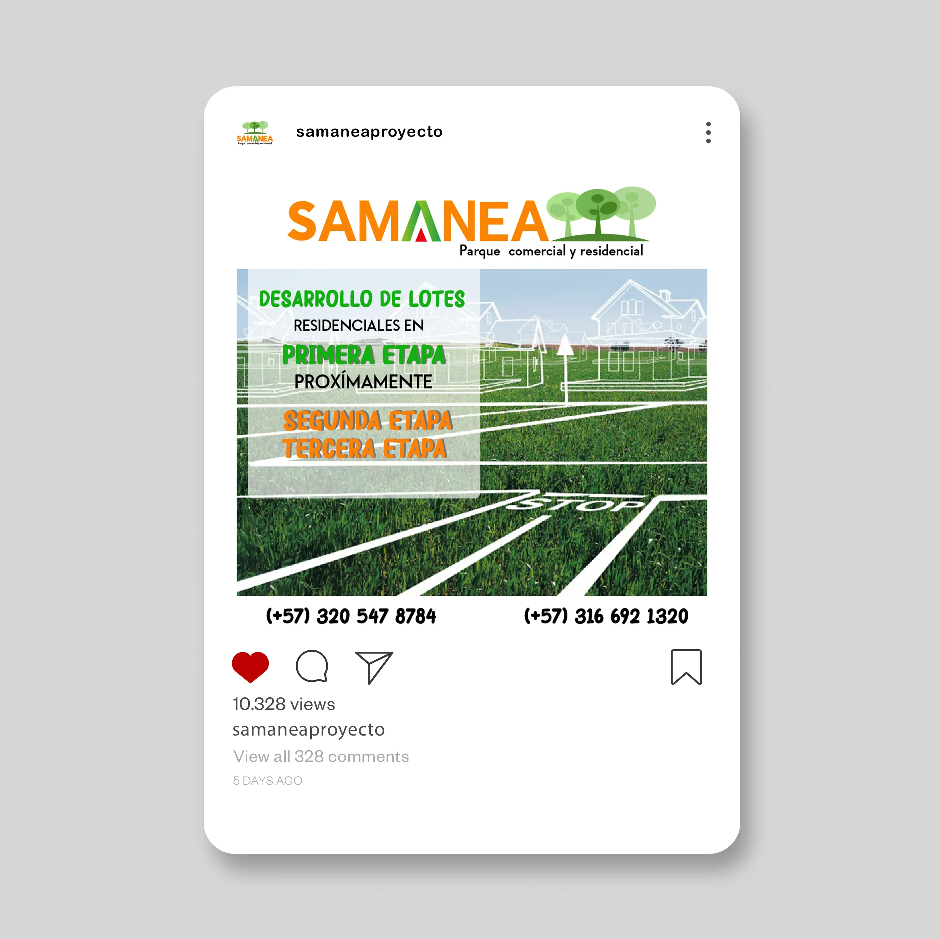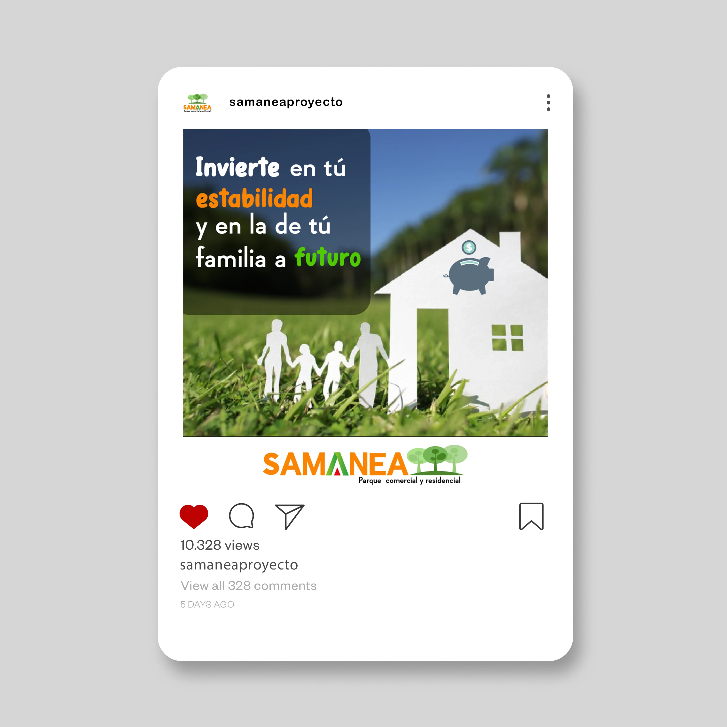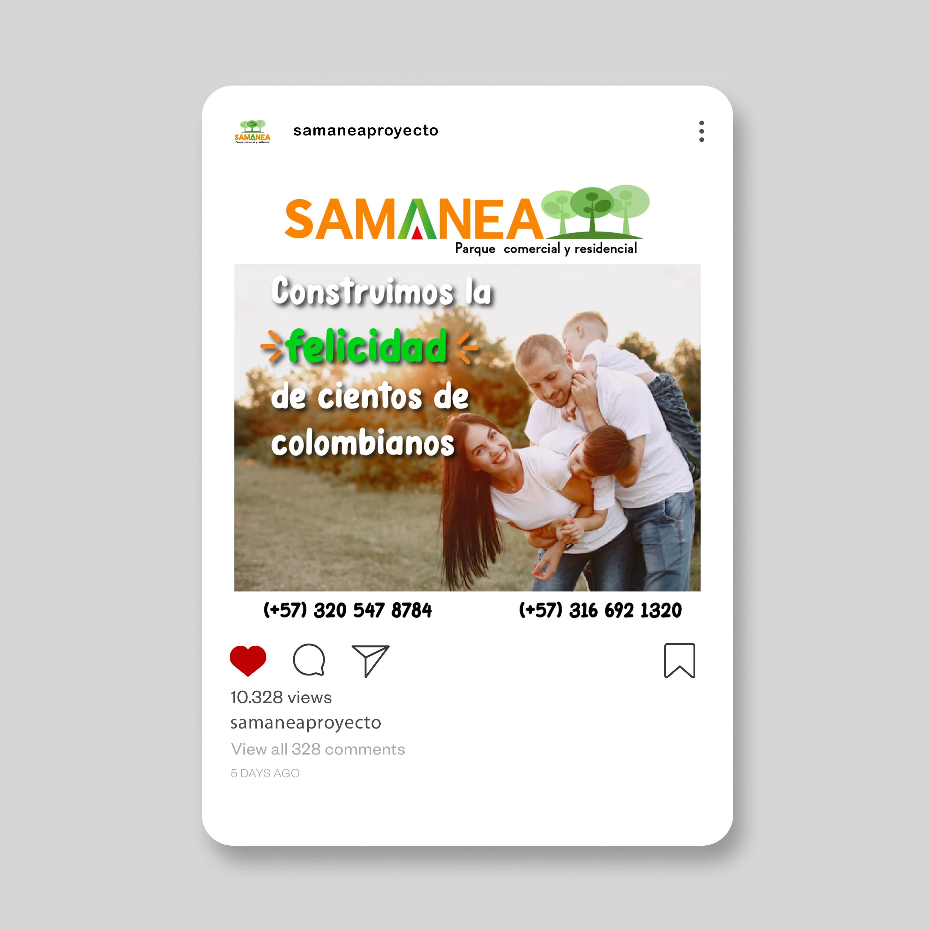 Samanea es un proyecto inmobiliario de parque comercial y residencial que gestiona su presencia en redes sociales mediante contenido promocional diseñado en Illustrator. El feed mantiene coherencia visual con elementos que transmiten un enfoque familiar y de inversión. Las publicaciones combinan imágenes de estilo de vida con información comercial, incluyendo datos de contacto visibles en cada pieza para facilitar la conversión de interesados en el proyecto.