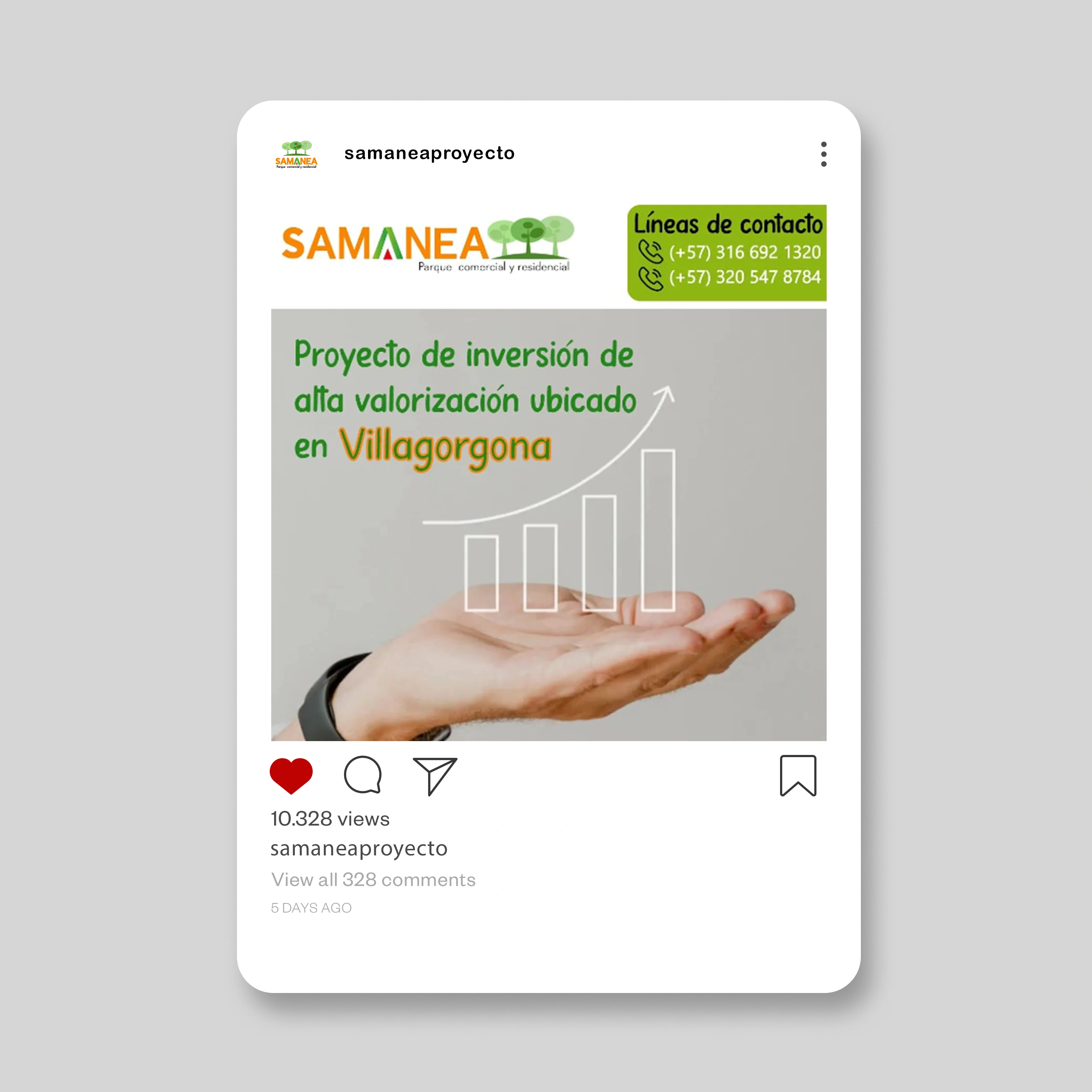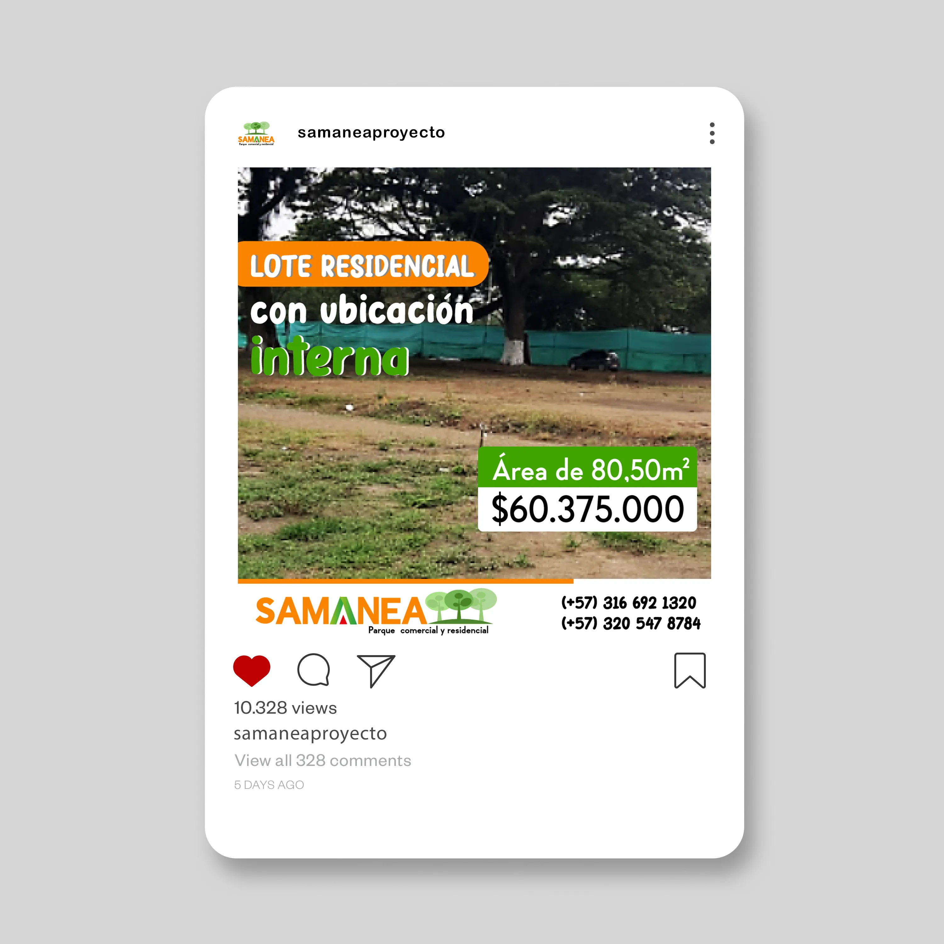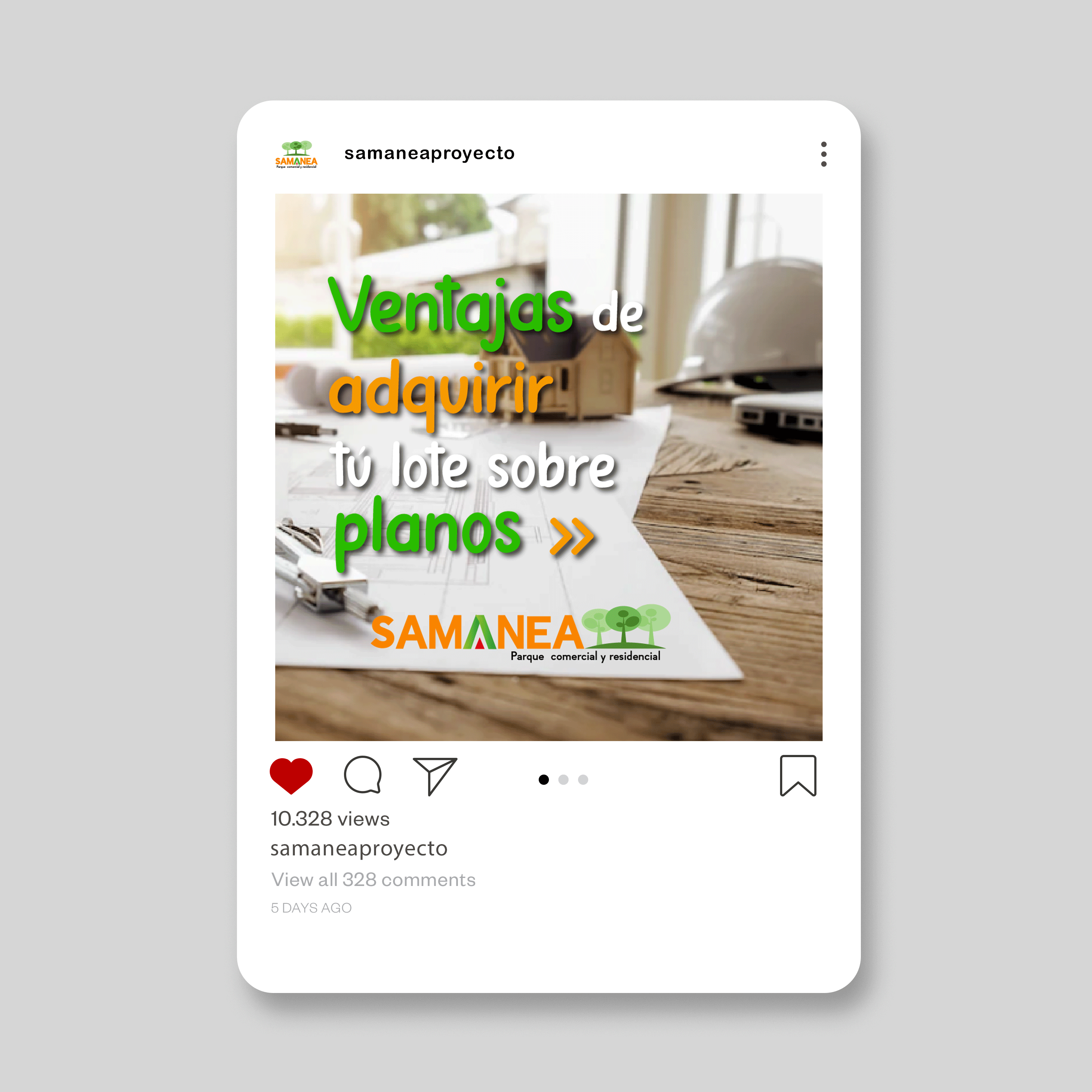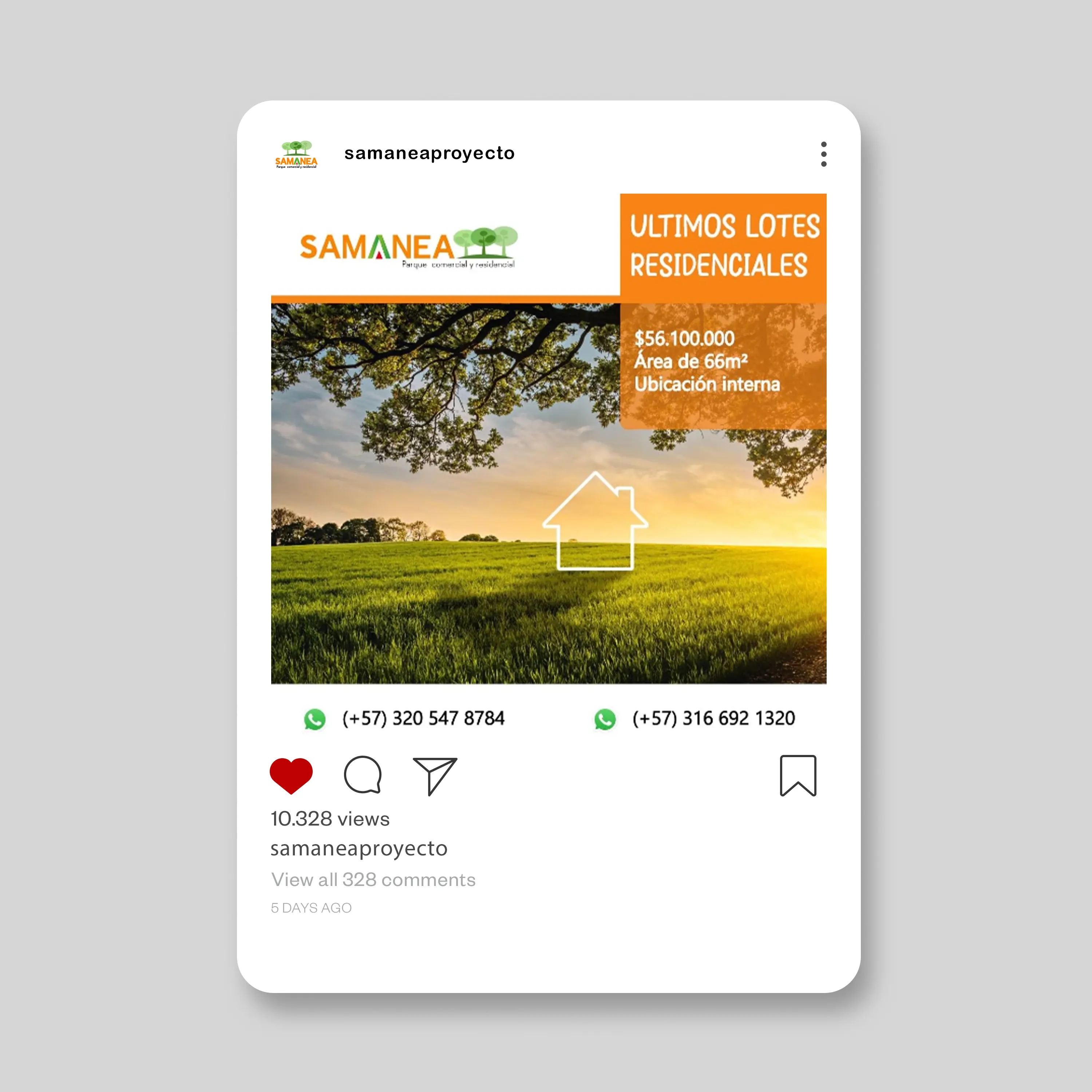 Samanea es un proyecto inmobiliario de parque comercial y residencial que gestiona su presencia en redes sociales mediante contenido promocional diseñado en Illustrator. El feed mantiene coherencia visual con elementos que transmiten un enfoque familiar y de inversión. Las publicaciones combinan imágenes de estilo de vida con información comercial, incluyendo datos de contacto visibles en cada pieza para facilitar la conversión de interesados en el proyecto.